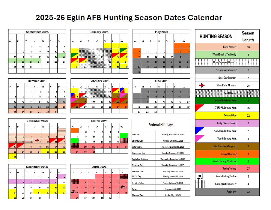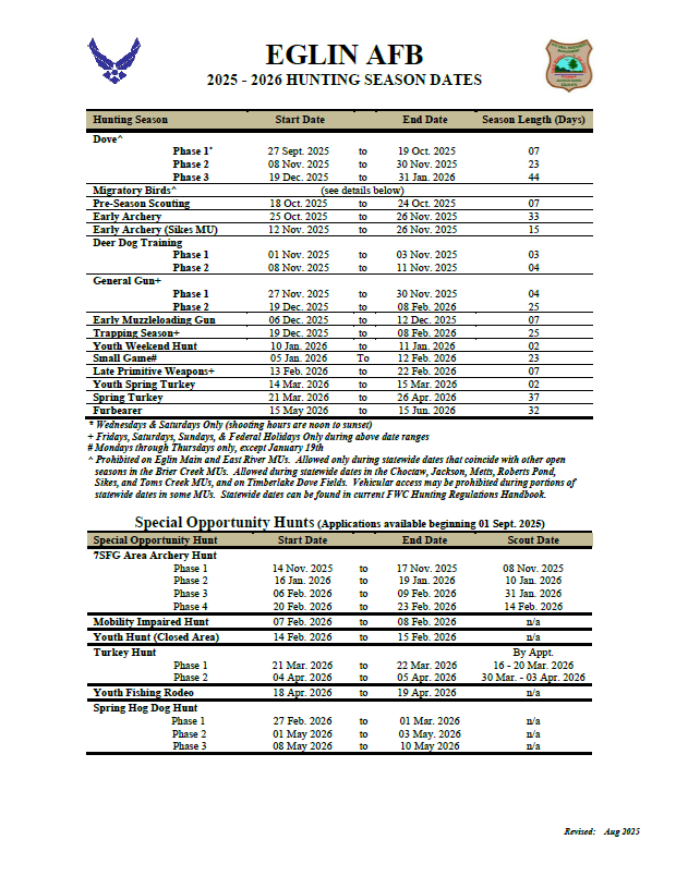 FY26 Eglin Hunting Seasons All visitors,16 YOA or older, to the Eglin reservation must have an Eglin permit and photo ID.