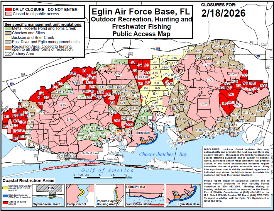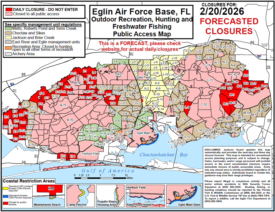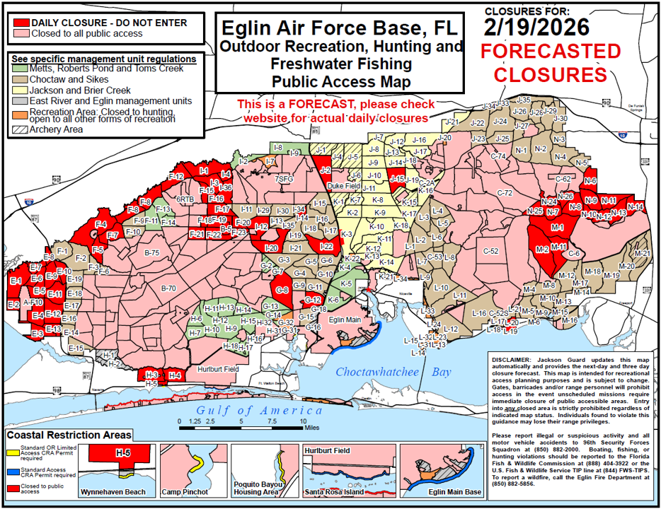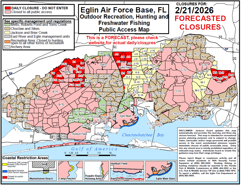 We are experiencing technical difficulties with the Eglin PAM and will update as soon as possible. While the issue is being corrected, please call the Eglin Information Line at 850-882-0007 for forecasted closures.